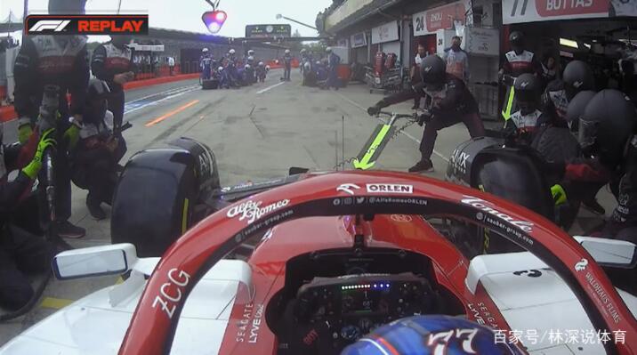 首次换胎过程由于换胎赛车众多,也出现了不少意外,先是阿尔法罗密欧车队给博塔斯换胎时间达到了11.8秒。然后周冠宇由于在博塔斯身后等待,也损失了不少时间。